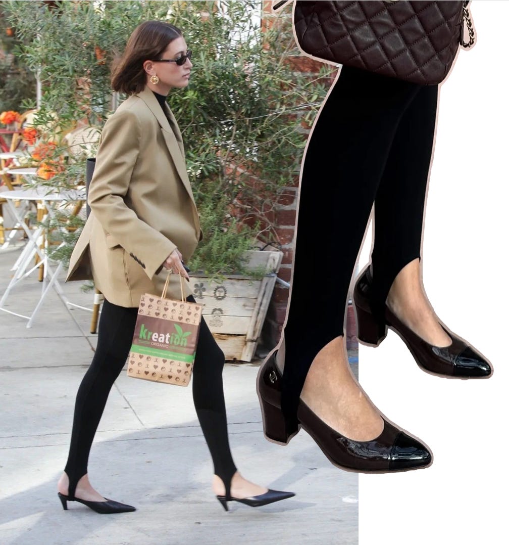 I’ve recently developed a small fascination for stirrup leggings, the ones with the little strap that goes under the foot. They originally come from equestrian and sportswear, but became very popular in the 1980s, when the fitness boom brought sleek, stretchy pieces like this from gyms and dance studios into everyday wardrobes.
