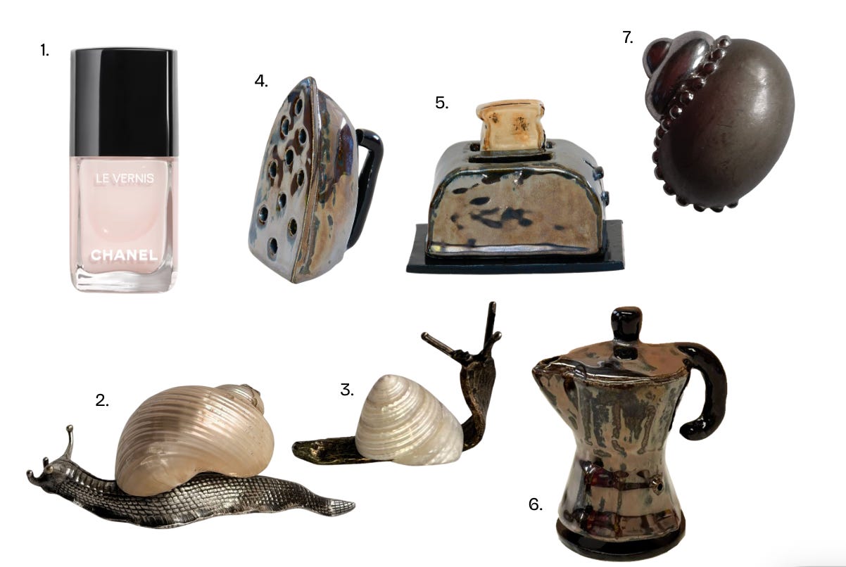 Lately, these are the cool bits that have caught my eye: from ceramic incense holders, to snail shell paperweights, or a shell brooch. One thing I did give in to was Les Vernis by Chanel, still one of the best nail polishes I’ve ever owned. The others are still very much on my mind, especially that little moka omg!!