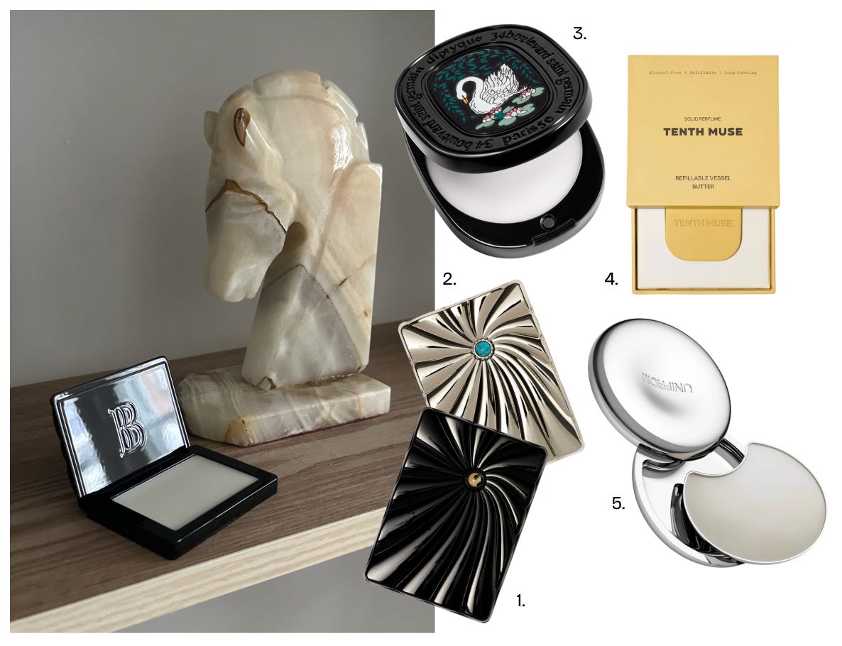 Solid perfumes are finding their way back into my routine, and I think I’m a little in love with them. They remind me of the same femininity as putting on earrings before leaving the house. Applying them with your fingertips, especially behind your ears, feels like part of that same gesture. I like that they can be kept, refilled, and returned to. I don’t know about you, but I often forget perfume when I am rushing out of the house, so having one in my bag feels both practical and chic, which is a combination I always fall for.